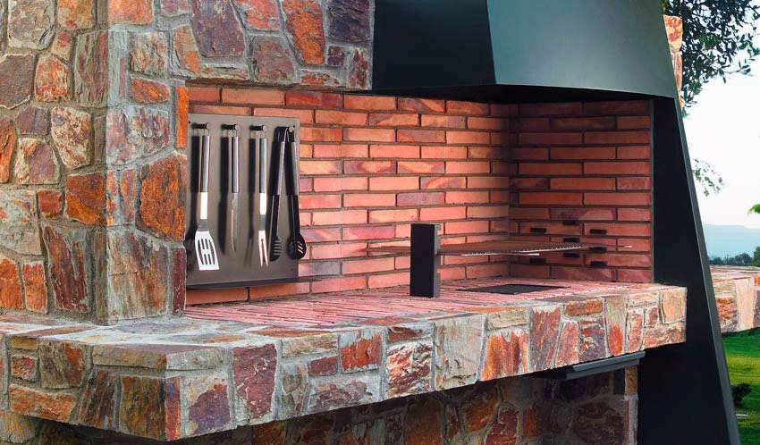 Четырехсторонняя барбекю из сланца Nicorella несимметричного с цементным швом. Топка и центральная плита из огнеупорного кирпича толщиной 5 см, кладка лесенкой. Со встроенной решеткой для жарки с направляющими. Боковая колонна, короб, колпак, раковина, слив и панель из черной нержавеющей стали.