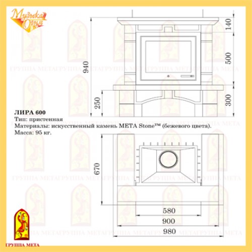 Каминная облицовка Лира 600 изготовлена из камня META Stone™ (бежевого цвета). Вставки в боковые панели выполнены из пеноблока и подготовлены для последующей отделки (может использоваться любая отделка, толщина материала не более 30 мм). Отделочный материал в комплект не входит.
