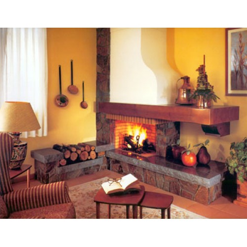 Угловой камин из сланца Nicorella неправильной формы с цементным швом. Плита из полированного камня San Vicente неровный кант. Консоль из огнеупорного кирпича толщиной 5 см. Быки и балка из Iroko. Кирпичная топка, открытая сбоку, банкетка и колонна.