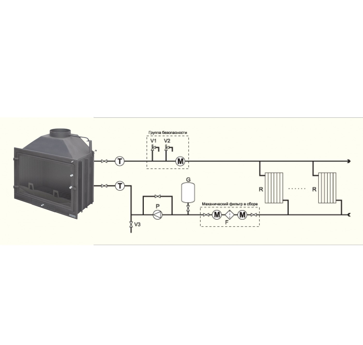 - водяным контуром (теплообменником), благодаря которому обеспечивается нагрев воды, которая поступает по трубам и прогревает остальные помещения;