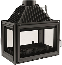 Модель топки с призматической стеклянной дверцей. Топка оснащена системой повторного дожига. Внутренние стенки очага из шамота. Система самоочистки стекла. Высокий дымосборник.