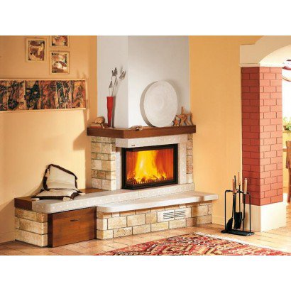 Облицовка из травертина, имитирующего кирпичную кладку. Очаг и полка из состаренного камня Giallo dIstria. Балка и банкетка из древесины грецкого ореха. По запросы: выдвижной ящик из древесины грецкого ореха.  На фото представлена модель с дровяной топкой HT 810. Dx - банкетка слева Sx - банкетка справа Roma ч
