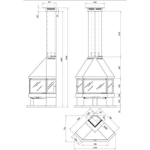 Отопительный камин для углового монтажа. Такой камин займет достойное место в загородном доме. Дверь и боковые стенки из стеклокерамики. Внутренние стенки очага облицованы огнепрочным материалом. В цокольной части расположена небольшая дровница для хранения дров. Система самоочистки стекла. Экономичный расход дров.