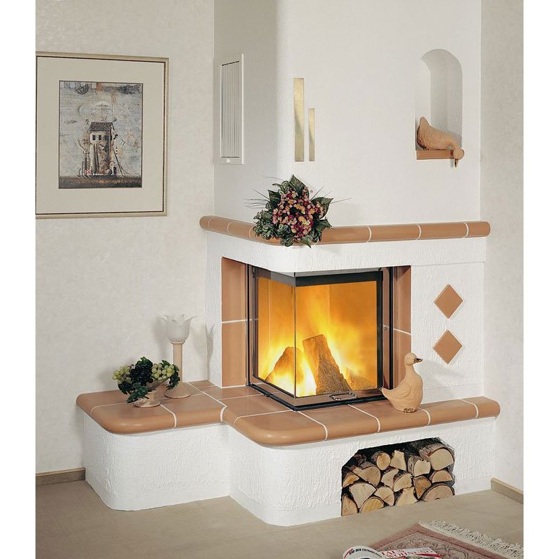 Пристенно-угловой камин из изразцов цвета cotto hell.