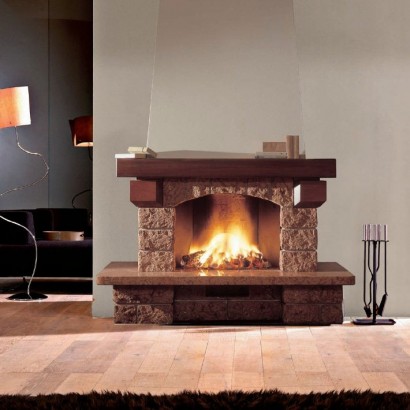 Под открытые топки. Традиционная облицовка из красного мрамора Assiago грубой обработки. Плита полированная, из того же мрамора. Деревянная балка.