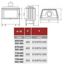 Угловая каминная топка с Г-образным стеклом. Боковое стекло слева. Топочная камера футерована шамотом. Подъёмный механизм двери (система Easy-Lift). Возможно подключение воздуха извне.