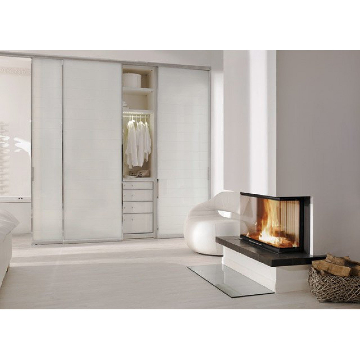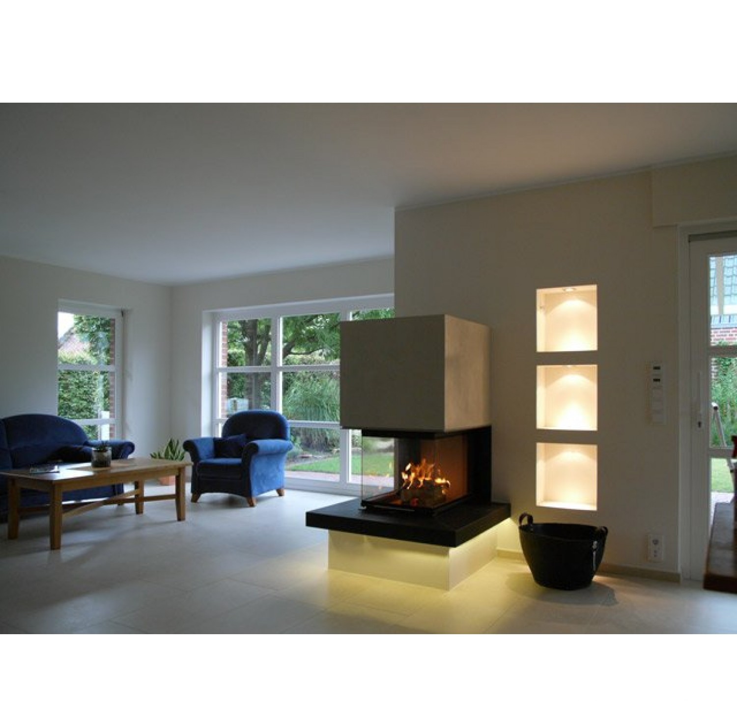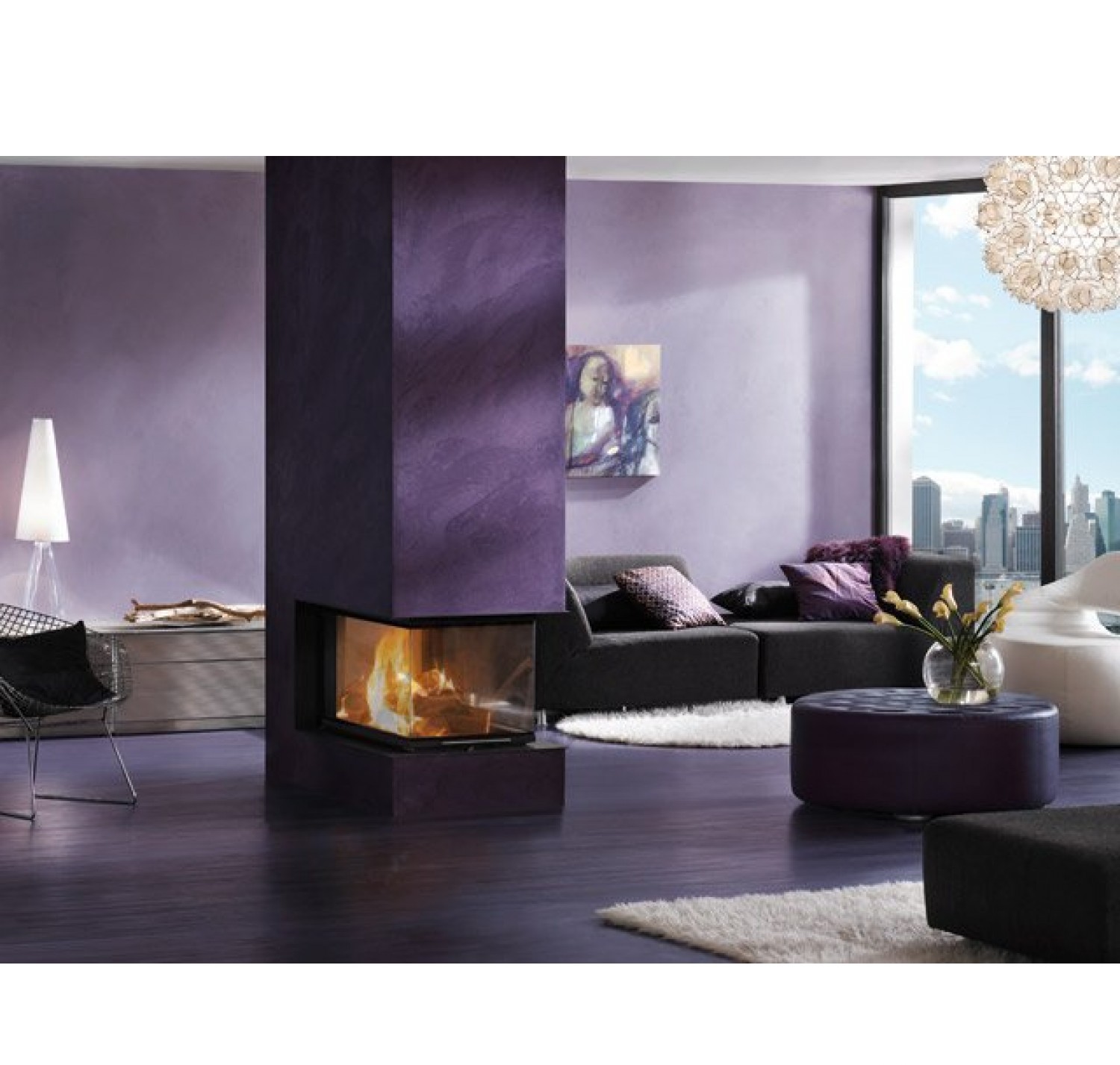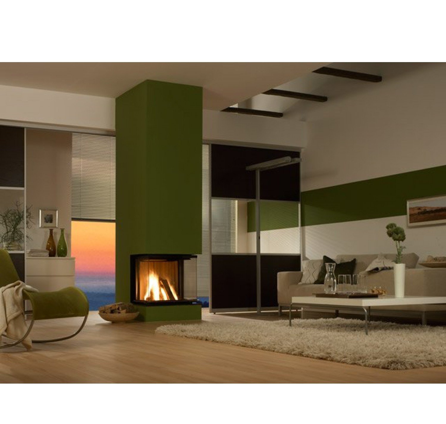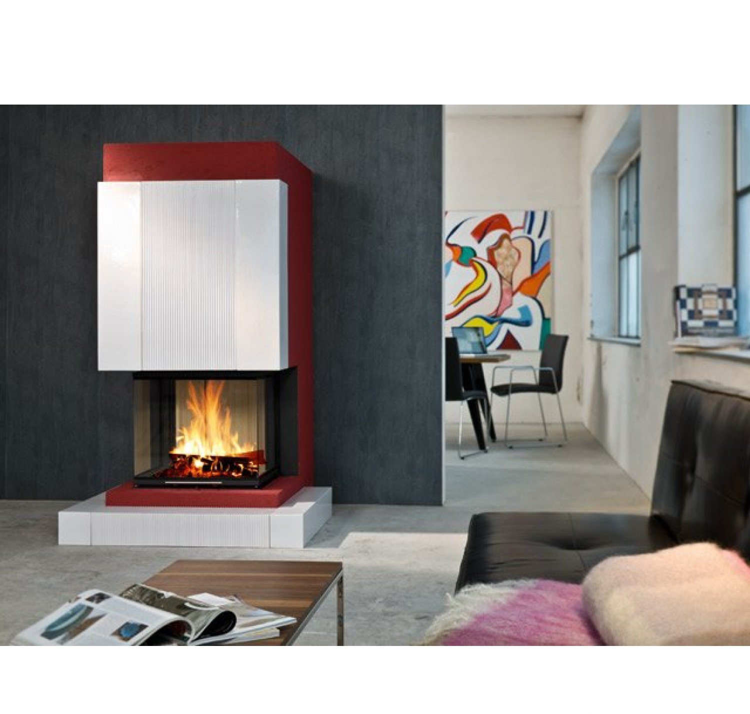 Трёхсторонняя каминная топка. Топочная камера футерована шамотом. Подъёмный механизм двери (система Easy-Lift). Ширина дверки 274+855+274 мм. Высота дверки 539 мм. Возможно подключение воздуха извне.