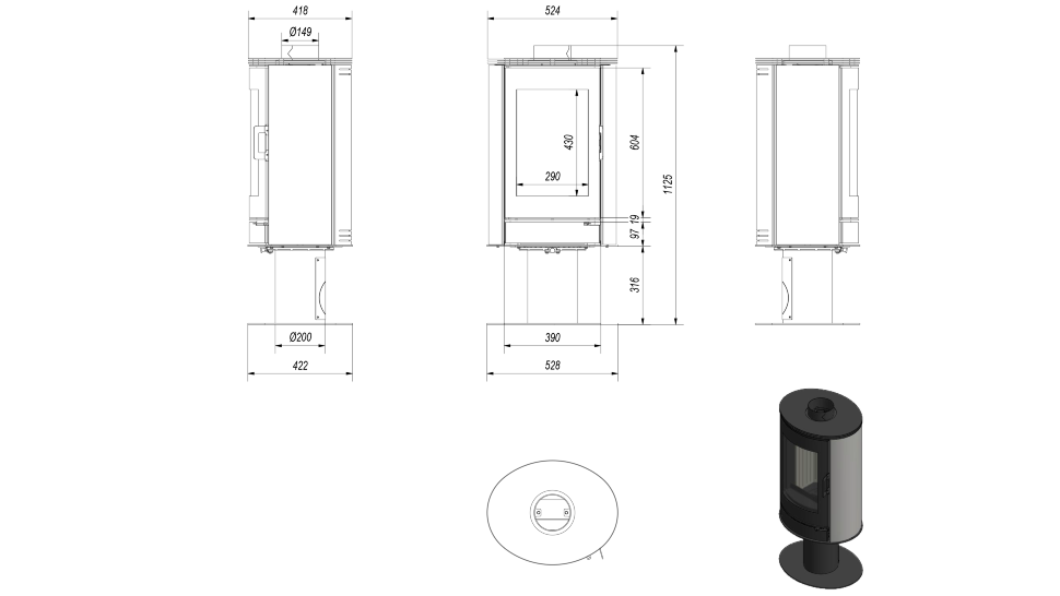 - Диаметр дымохода, (мм) 150