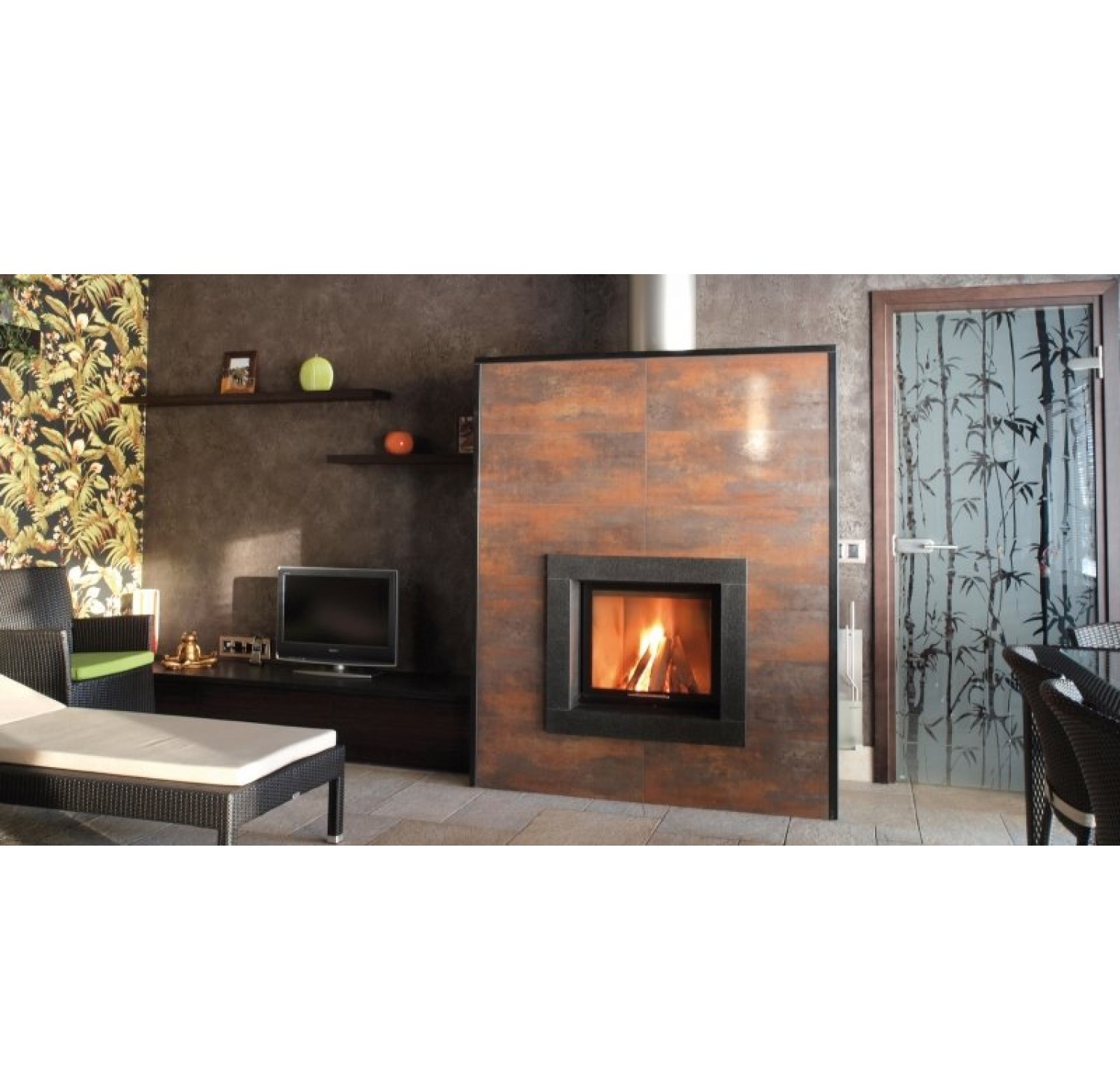 Минимализм не терпит излишеств и ярких красок, но цветной тонированный край стеклянного фасада лишь деликатно смягчает его подчеркнутую суровость. Модель, работая в обычном режиме, обеспечивает отопление помещения общей площадью не менее 70 квадратных метров. Высокий КПД достигается за счет использования в конструкции топки современных материалов и технологий.