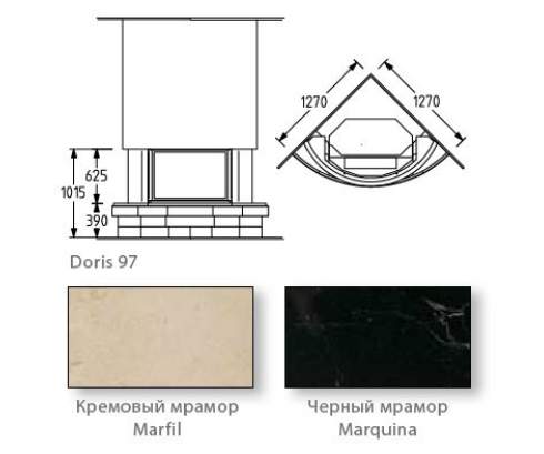 Стильный угловой камин в стиле модерн сочетает в себе четкость линий и плавность изгибов. Модель Doris 97 выполнена из белого камня Прованс. Полка отделана черным мрамором. Возможно также изготовить модель из мрамора.